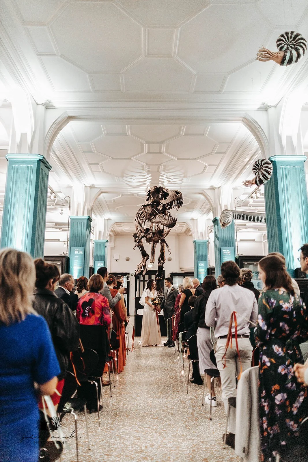 Emily and Rob were married beneath the towering presence of the museum’s iconic T-Rex, surrounded by history, curiosity, and natural wonder. The venue brought all the drama and Emily brought all the grace.
